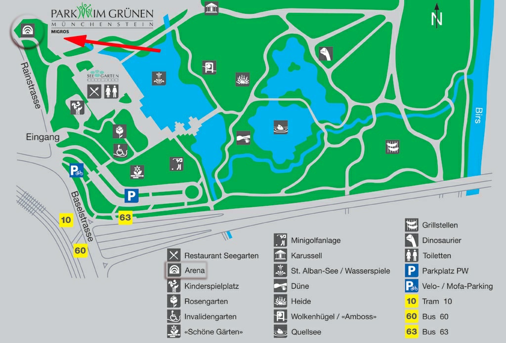 Anfahrt zur Arena (Freilichtbühne) im "Park im Grünen"/Grün 80 Münchenstein. Die Arena befindet sich im "Park im Grünen" direkt hinter dem Restaurant Seegarten. Im Park ist der Weg zur Arena ausgeschildert.